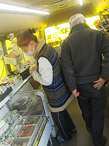 宮園団地に到着してしばらくすると、団地のおばあちゃんが急いで来られました。「グランドゴルフをしていて・・・間に合ってよかった」と買い物をされました。
