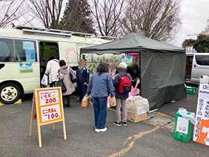 ひろやす荘では、曇りで玄関前は風が強く寒かったので心配しましたが、多くの方が来られました。いつも車いすで来られるおばあちゃんは、玄関のドア前で外に出ずに職員さんに買い物をお願いされていました。
