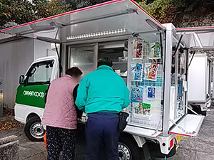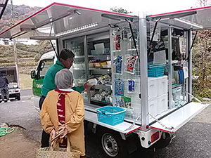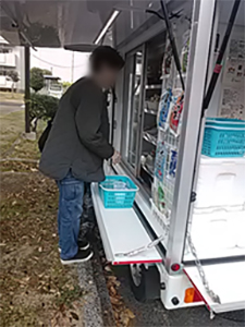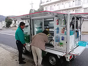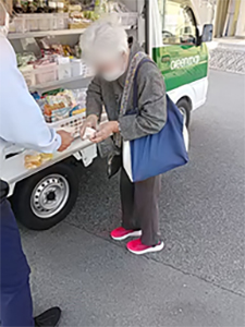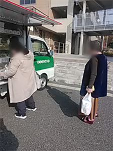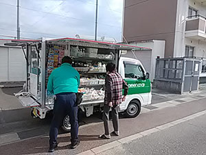 「豆腐が欲しいけどあるかね~」と、初めて顔を見せていただくおばあちゃんに声をかけていただき、もめん豆腐をお買い求めいただきました。また、「母親の介護に通って来てるんです」とお話しいただいた組合員さんにも、「音楽が聞こえたんで買いに来ました!」と声をかけていただき、ご両親が簡単に食べられるものをとお買い物いただきました。