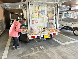 下原田第一仮設団地では、びん牛乳を買われる常連の方は、追加で野菜やヨーグルトを買われました。別の方はお惣菜やパン、冷凍野菜を買われ、また別の方は、先週注文いただいた品を購入され、追加でお惣菜やお菓子買われました。次回、お正月用の注文をいただきました。