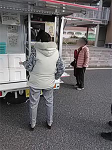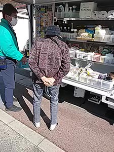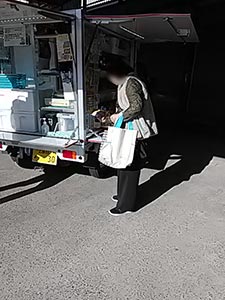 「日が差すと暖かいね~来てくれるのを待ちよったわ~」といつも来てくださるお母さんに声をかけていただきました。もめん豆腐、ちくわ4本組、ミニ肉まん、他をご購入いただきました。