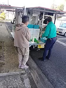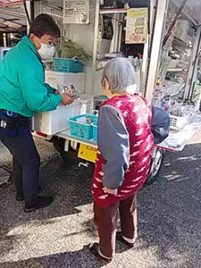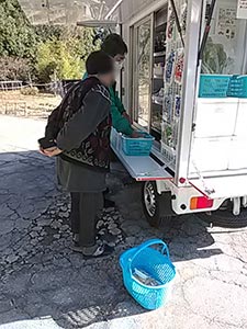 お天気もよかったせいか、お2人で集会所前に腰かけてお待ちいただいていました。井戸端会議に花が咲いたとのことで「久しぶりにゆっくり話せたわ~」とお話しいただきました。みんな元気ヨーグルト、絹ごし豆腐、だしパック、他をご購入いただきました。