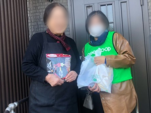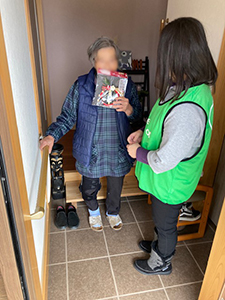 ・朝倉市在住の方に、しめ縄、パック餅、きなこ、こしあんをお届けしました。訪問されることを楽しみにしていたと言われていました。最近は、週に1度の買い物を楽しみにされている様子ですが「運転免許証の返納なども考えないといけないが、車がないと生活できないから」と仰られていましたので安全運転には十分気をつけていただくようにお話ししました。年末は親戚が来られることも楽しみにされているとのことでした。