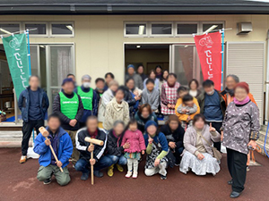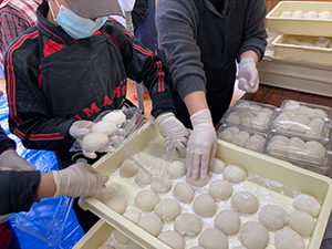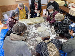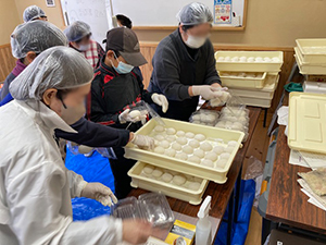 ・朝倉市役所、朝倉市社協からも参加され、団地の方々も毎年参加されていますので、慣れた手つきで餅を丸めてパック詰めしていき、参加できなかった団地のみなさんにも配布されました。