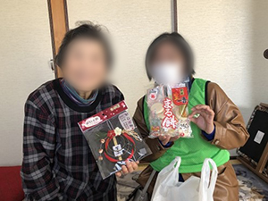 ・朝倉市にお住まいの方に、丸餅、つぶあん、きな粉、しめ縄飾り、黒豆をお届けしました。訪問した時間は日曜日のお昼ごろでしたが、横になられていました。ご本人は「なんとか元気しとるよ」と元気な様子でした。デイサービスのことや趣味の手芸のお話を伺いました。今年も趣味の手芸もされていて、お土産にポーチをいただきました。
