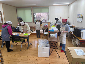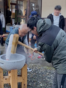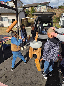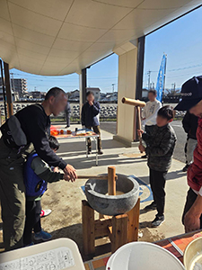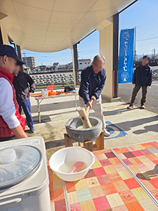 球磨村一勝地友尻地区の餅つきの応援に行きました。スタッフは、グリーンコープ生協くまもと2名、ワーカーズ常勤3名、社会福祉法人グリーンコープ3名、ヒトハレ2名です。日程での行き違いがあり、前日に半分の量を地元の方で鏡餅にしてくださっていました。本当に申し訳なかったのですが、本日も沢山の方が集まられていました。寒い中、焚き火もして下さって餅つきしました。5年前は小学生だった子どもたちが中学生になり、一生懸命に杵でついてくれました。昨年は、嵩上げの為に線路が道路になっていましたが、嵩上げが終わったため今は使われていないそうです。工事が終わり、地区に戻って来られた世帯もあるようで、発災時に地区長だった方が今年の鏡餅の数が増えたことにとても喜んでいらっしゃいました。また、この日にしか会えないグリーンコープ職員との再会を喜ばれている方もいらっしゃいました。餅つき後には、カレーと地区長の方が作って下さった猪汁を頂きました。猪汁がとても美味しかったです。前日のニコニシ食堂の餅つきの時に、組合員の方が「明日用に持って行って」と大きなタッパーに沢山の大根の漬物を頂きました。とても好評で「今度レシピを教えて下さい」と言われる方もいらっしゃいました。離れた地域でもこういう風に私たちを通して交流できるのはとても良いなと思いました。