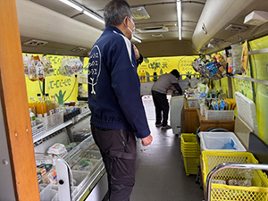 広崎第三団地では、毎回来られる方が今日は水を2ケースとみかん類2袋、肉、野菜とたくさんご購入いただきました。