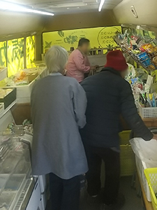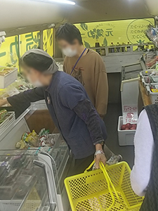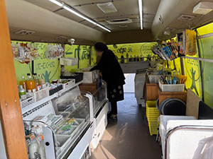 下田地区に到着すると、いつもリュックを背負っておられるおばあちゃんが待っていました。元気カーに乗り込むと「間違えて昨日ずっと待っとった。いつも来られる近所のおばあちゃんに聞くと、曜日を間違えてると言われた」と仰っていました。お肉、冷凍食品、お菓子等を買って行かれました。