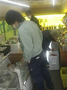 広崎第三団地では、毎回来られる方が今日は水を2ケースとみかん類2袋、肉、野菜とたくさんご購入いただきました。