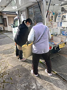 岳本地区では、常連の方がたまごや豆腐、野菜を買われました。別の方は外出前に早々に買い物を済ませられました。