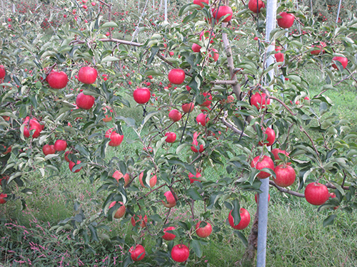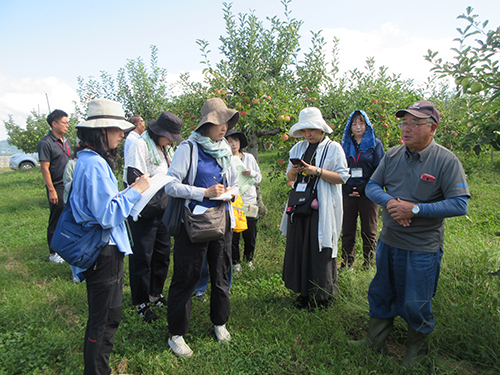 山の傾斜地に広がる16haの園地に、6,000本のりんごの木が植えられていました。そのうち4割がふじで、今は早生のつがるが赤くなっていました。50年前は15,000本あったりんごの木は半分以下になり、木も低く手の届く高さにし、管理しやすくしているそうです。この圃場は輸出を考えて特別栽培で除草剤不使用とのことでした。