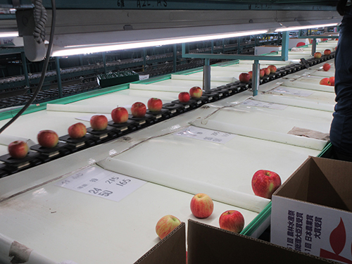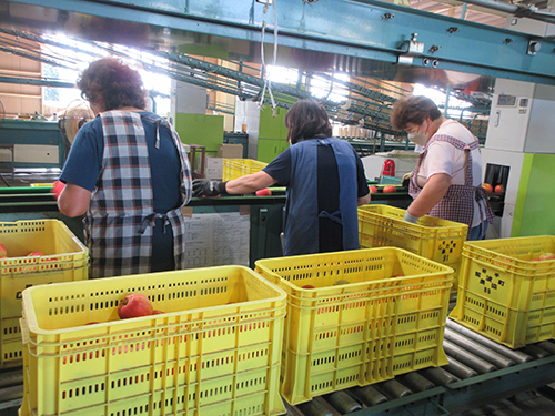 最後に見せていただいた紫波選果場では、1日に18kg入るコンテナ600~650箱分を箱詰めして送り出しています。キズやサビを人の目で探して省き、ここではじかれたものが加工用になります。その後、色と大きさを判別するカメラを通り、等級を自動選別します。赤くてキズがないほど等級が高く、6等級に分けられます。大きさは10段階に分けられ、箱詰めは人の手で行われていました。1箱に32~40玉入るくらいの大きさが、売れ筋だそうです。
