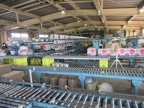 手作業で箱詰め後、レーンに乗せて冷蔵庫へ
