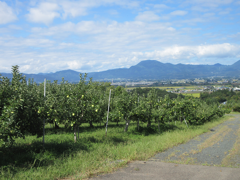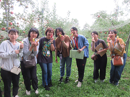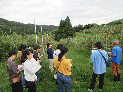 今後もりんご栽培や産地を守っていくために、今まで培った知恵や工夫を凝らしながら、生産者も安定して栽培できるように努力されていました。除草剤不使用で手入れの行き届いた圃場には、大切に育てられたりんごが色づいていました。気候変動や後継者問題など産地での厳しい現状や日ごろのご苦労に触れ、カタログGREENやグリーンコープの店舗などで購入できる「当たり前」が、いつまでも当たり前ではないという現状を改めて感じました。