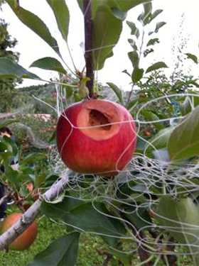車がやっと1台通るような山道を奥へ奥へ上り進めたところに藤村さんの圃場がありました。私たちが視察に訪れた日はきおうの収穫がほぼ終わり、つがるがちょうど収穫時期を迎えているとのことで、赤く色づいたりんごが可愛らしくたわわに実っていました。この圃場は標高が高く花が咲くのが1週間ほど遅いため、他よりも小玉傾向ですが、今年は7月に雨が降らなかった影響でさらに小玉になっているとのことでした。また暑い日が続いて夜温が下がらないことで、実は熟しているのになかなか色が付かず、収穫時期の見極めが難しいとも話され、ここでも気候変動の影響が出ていることを感じました。渡り鳥がつついていくため、木に網をかけたりキラキラの防鳥テープを渡したりして対策されていました。岩手でも後継者不足は課題となっていますが、藤村さんの圃場はまだ小さい子どもさんが継ぐと話されているそうで、きっと普段から生き生きと栽培に取り組まれているのだと思い、嬉しくなりました。