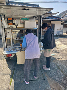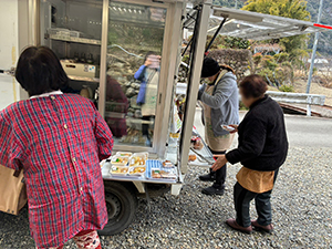 蔀地区では、2名で待っておられました。「寒いねー」と出て来られ、いつものお豆腐やたまご、お菓子など買われました。
