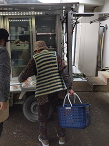 下原田第一仮設団地では、1名の方はお惣菜や果物を購入され、別の方は「買い物に行かれんけん待っとたよ、助かる」と言われ、お惣菜や果物を買われました。別の方は、先週注文いただいた品を買われ、来週も沢山の注文をいただきました。