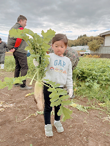 久留米南地域委員会で、「赤村産直の会」との産地交流に行ってきました。大根の圃場へ移動し、皆で大根の収穫体験をしました。圃場では、生産者の皆さんに大根が少し土から出ている、細いものより太いものを選ぶとよいなど収穫のコツや収穫方法を教えていただき、お子さんもたくさん収穫して楽しんでいました。収穫後は皆さんと昼食を食べながら交流会を行いました。異常気象の影響や、農薬制限の話もありましたが、生産作業を苦労とは思っておらず、楽しんでいるとの話は印象的でした。ただ、注文が少なく出荷されずに圃場に残った作物を見るのが悲しいとのお話もありました。暑い中、寒い中、一生懸命作ってくださった生産者の方々に感謝して、これからもグリーンコープのお野菜を買って応援していこうと思いました。