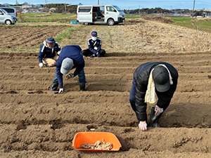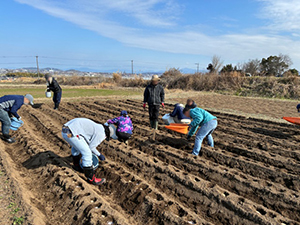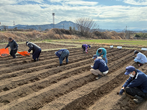 益城町東無田の畑にじゃがいもの種芋植え付けをしました。参加は災害支援センタースタッフ4名、生活再生相談室より就労支援事業の対象者3名とスタッフ3名です。10畝に約380個の種芋を植え付けました。作業は種芋を植え付けた後、種芋と種芋の間に肥料を一握り置いて土を被せて終了です。天気が良く作業をすると汗ばむ程でした。支援対象者のみなさんは日頃外で作業する機会がなく、楽しい時間を過ごせて良かったと思います。6月中旬には収穫予定です。また、3月中旬にも野菜の種まきに来ていただきたいと思います。