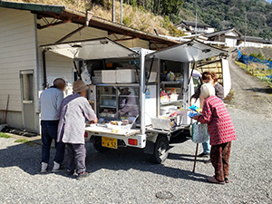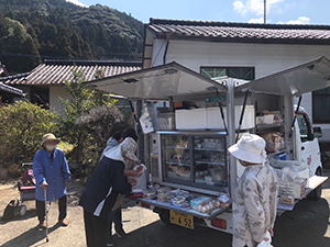 球磨村公営住宅、球磨村各地区で、見守り活動を含む移動販売を行いました。