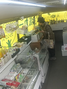 乙女団地では、いつもの常連の方がお買い物に来られました。お一人は規格外りんごをお気に入りで、他にも牛乳や納豆や乾物類などもたくさん買われます。