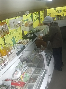 乙女団地では、いつもの常連の方がお買い物に来られました。お一人は規格外りんごをお気に入りで、他にも牛乳や納豆や乾物類などもたくさん買われます。