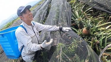 パインの葉は思った以上に固く、鋭いギザギザで、収穫時には手や足を傷つけることもあるそうです。ねずみ、いのしし、キジ、カラス、クジャクなど、パインの天敵は沢山!害獣避けのネットの下に手を入れて、色付いたパインを鎌で一つひとつ刈り取り、背中に背負ったカゴに手早く入れていく様子は圧巻!カゴは20キロにもなるそうです。4月でも気温が30度近い炎天下の中での作業は過酷で、出荷してくださる生産者の方々への感謝の思いが深まりました。