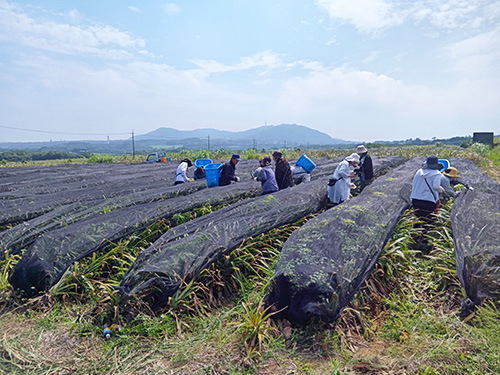 西表島は、木陰にいると涼しいがひとたび太陽の下に立つと、ジリジリとした強い日差しが肌を刺し、汗がとまりませんでした。案内された圃場は、約2万玉のパインを栽培している圃場で、グリーンコープに出荷するボゴールパインがとても大きくなっていました。日よけや鳥害などから守るため黒いネットがかけられていて、あとは色づくのを待っていました。パインの栽培に適した酸性土壌で、日差しの強い西表島で太陽を存分に浴び、減農薬栽培でゆっくりゆっくり育ったピーチパインやボゴールパインの美味しさを知ってほしい!とどんな時も手を抜かず努力されている姿を知り、感謝の気持ちがあふれました。