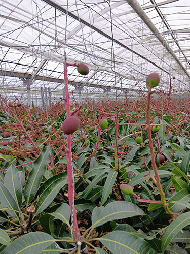 マンゴーの木は、5棟のビニールハウスに1,700本程あるそうです。一つひとつの枝に紐を付けて調整する作業がとても手間がかかり、収穫後の剪定作業など一年中手間暇かけながら大切に作られていることがわかりました。
