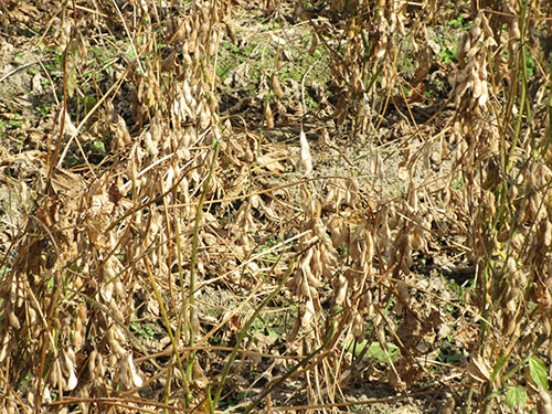 秋晴れの陽射しを受けて、大豆畑の黄金の世界が広がっていますが、今年は青いままの株が見受けられます。