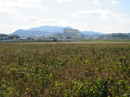 まず最初に「JAむなかたカントリーエレベーター」内を見学しました。令和2年に稼働開始したまだ新しい施設です。収穫した麦(小麦・大麦)・米・大豆はここに運ばれます。トラックごと計量した後、粗選機で大まかなゴミが取り除かれた大豆は、次に除湿された風で水分量12%まで乾燥されます。ある程度たまったら大豆の形や粒の大きさ(小粒・中粒・大粒)を機械を通して選別し梱包され、あとは出荷を待つだけです。見学時は大豆の収穫がまだ始まっていませんでしたが、この施設がフル稼働するくらい収穫量が多いことを願いつつ、大豆の圃場へ向かいました。