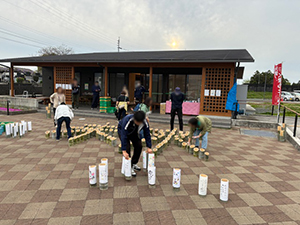 スタッフは災害支援センター、職員、組合員さん、組合員事務局で、16時30分頃から準備を始めました。竹灯りで「未来」の文字を作り、メッセージも用意しました。