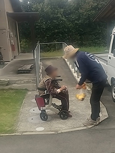舞原第二団地で見守り訪問している男性宅に伺うと、病院のスタッフさんが来られていました。何を買われるのかお聞きしていると、「からあげが食べたい」と言われました。確か先週はスタッフさんに止められていたと思いますが、今日は「聞かなかったことにします」と言われ「からあげ」をお渡しすると、とても嬉しそうでした。