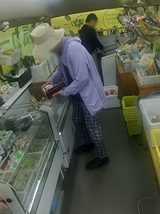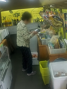 安永団地では、毎週来られる方は甘酒をよく買われます。もう1名の方もよく買われます。元気カーには2本あって、最初に来られた方が1本取られて、もう1名の方が買われるかどうか様子を見ておられました。その方が買われず帰られたので「じゃもう1本」と手に取られました。