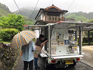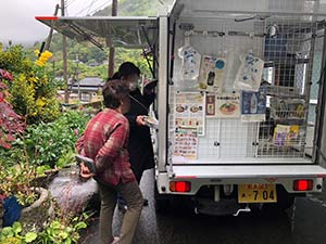 球磨村沢見地区では、小雨降る中買い物に来店くださいました。予約の牛乳、納豆、刺身、卓上のりを買われました。