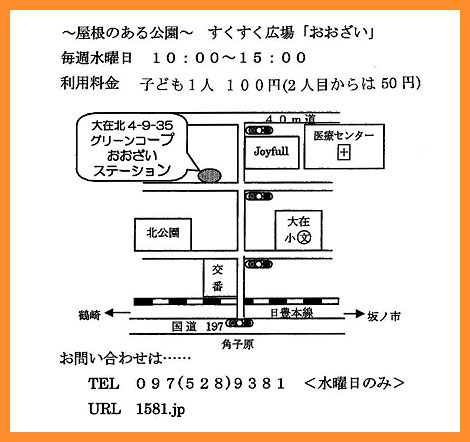 すくすく広場は、大分市大在(おおざい)と別府(べっぷ)市石垣西の2ヶ所にあります。プレママ、子育て中の方、どなたでもご利用できます。
