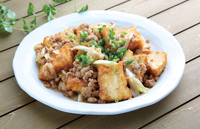 - フライパンにごま油(大さじ1)を中火で熱し、(1)の絹厚あげを入れて表面に焼き目をつけ取り出す。フライパンにごま油(大さじ1)を足し、Aを弱火で炒める。香りが立ったら白ねぎとミンチを入れて炒める。