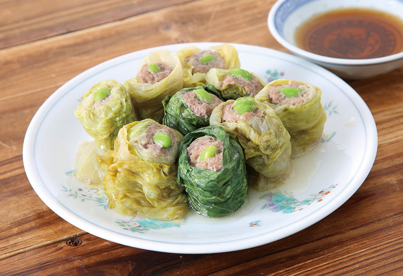 - (3)の中心にえだまめを1粒ずつのせてふんわりとラップをかけ、電子レンジ(600W)で6分程加熱する。からし醤油などにつけて食べる。