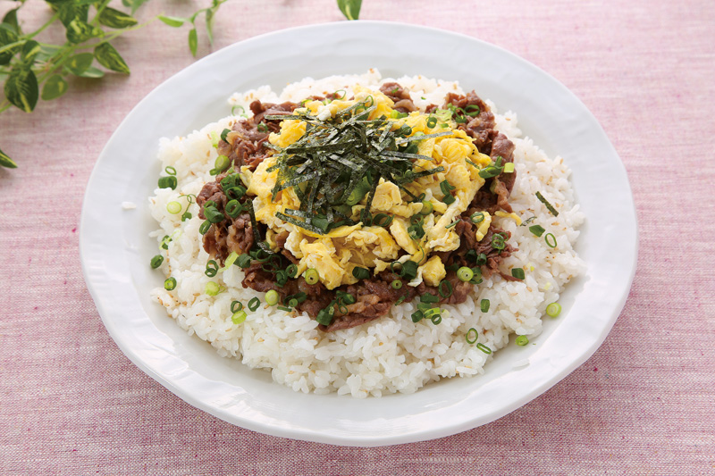 - フライパンに油を中火で熱し、牛ロースたれ漬を入れて炒める。