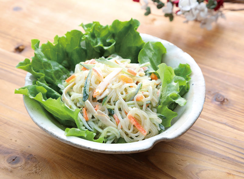 - ボウルにAを合わせ、(1)のはるさめ、ロースハム、人参、きゅうりを入れて混ぜ合わせ、器に盛る。