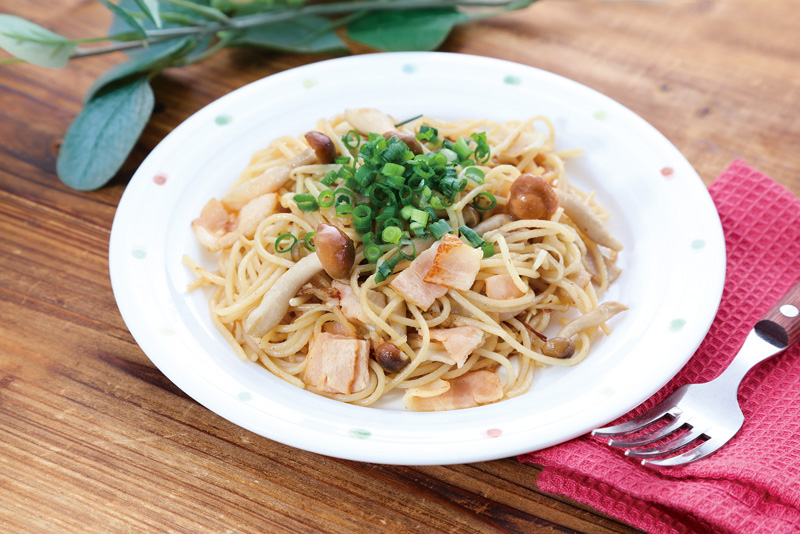 ※きのこの食感にベーコンのコク。グルテンフリーの玄米パスタで、和風オイル味。