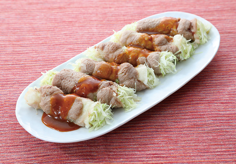 - 豚肉は少し置いておくと開くので、肉の端に千切りキャベツ(適量)をのせてきつめに巻き、巻き終わりを下にして耐熱皿に並べる。
