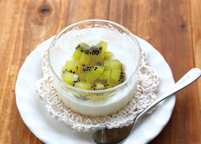 - キウイは皮をむき1cm角切りにし、きびさとう(大さじ1)を加えて混ぜ、冷蔵庫で冷やす。耐熱容器にゼラチンと牛乳(大さじ2)を入れてふやかす。