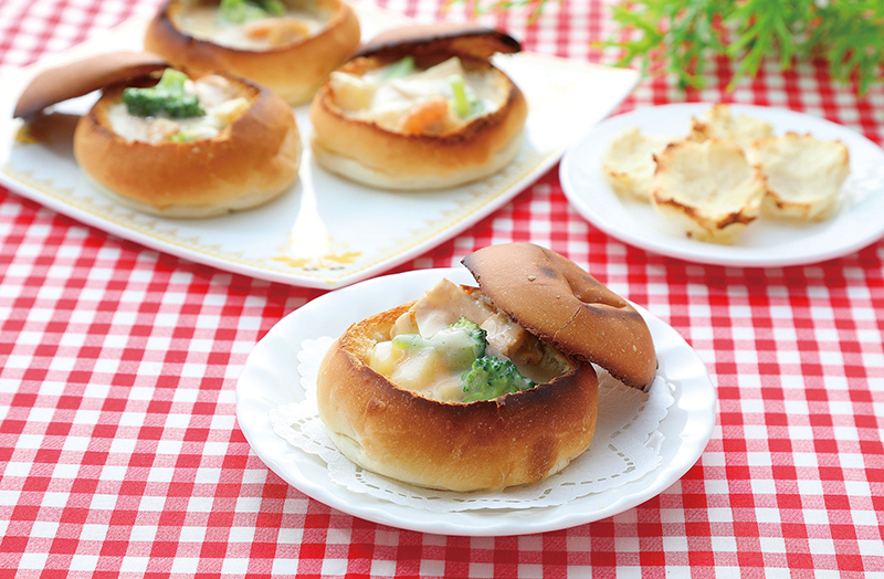 *くり抜いたパンは、トーストして添える。シチューはたくさん残ります。パスタを和えたり、普通にシチューとして食べてください。