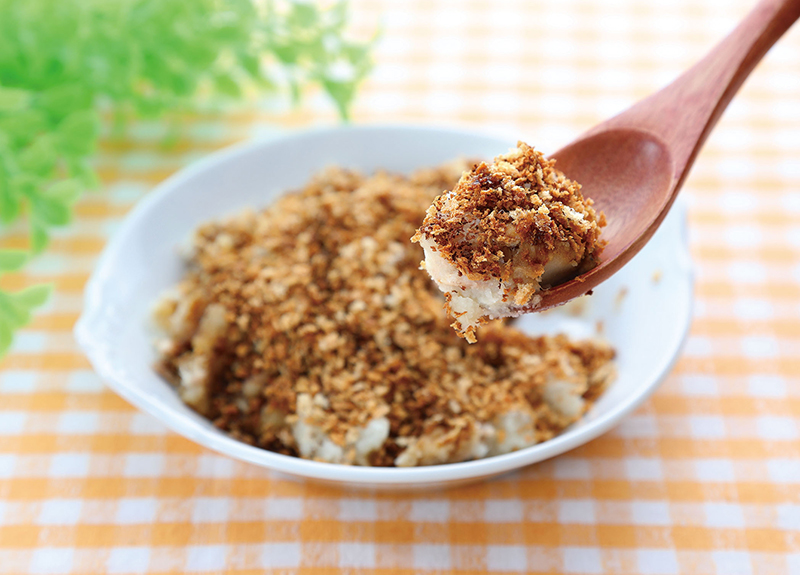 3. フライパンにパン粉を入れ、茶色になるまでよく炒って、(2)の上に広げる。
