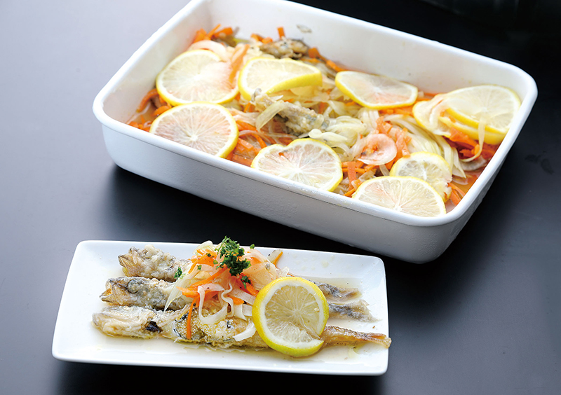- ししゃもは解凍し水気を取り、小麦粉をまぶす。フライパンにオリーブオイル(100ml、分量外)を中火で熱し、ししゃもを入れ両面に焼き色がつくまで3分程揚げ焼きにする。