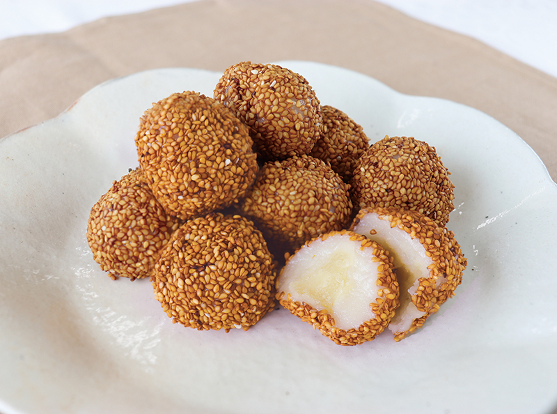 - (4)のだんごの水気を拭き取り、いりごまをたっぷりつけて、トースターで3分程焼く。