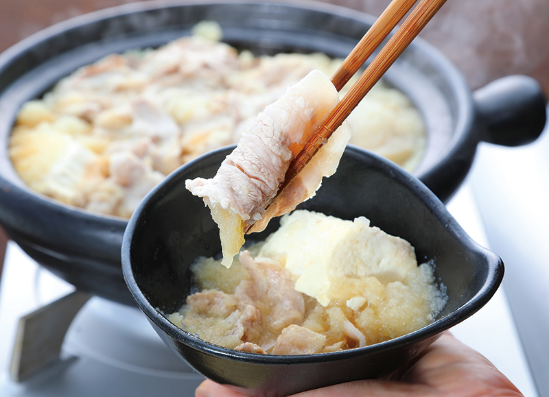 - 土鍋に昆布を敷き、大根を入れ、豆腐をのせる。長さを半分に切った豚バラを重ならないように、豆腐の上に並べる。
