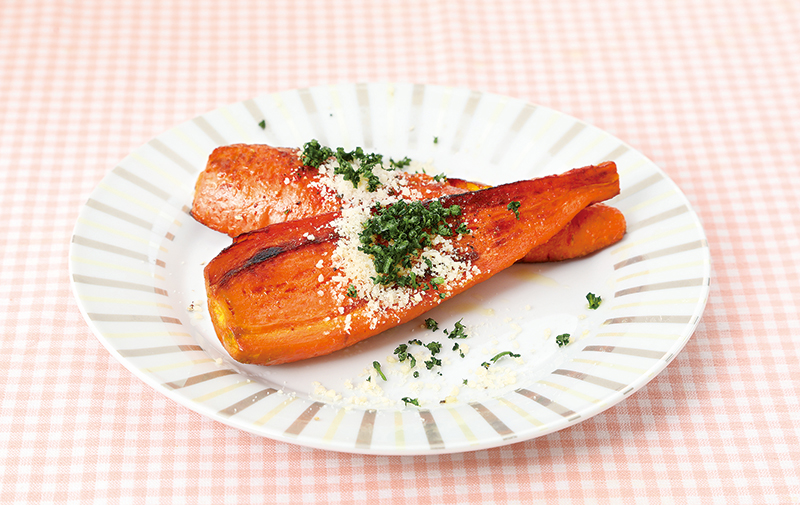 - (3)のフライパンに人参を並べ入れ塩の半量を振り、フタをして中火で5分程焼く。裏返し残りの塩を振り、さらに4分程焼く。
