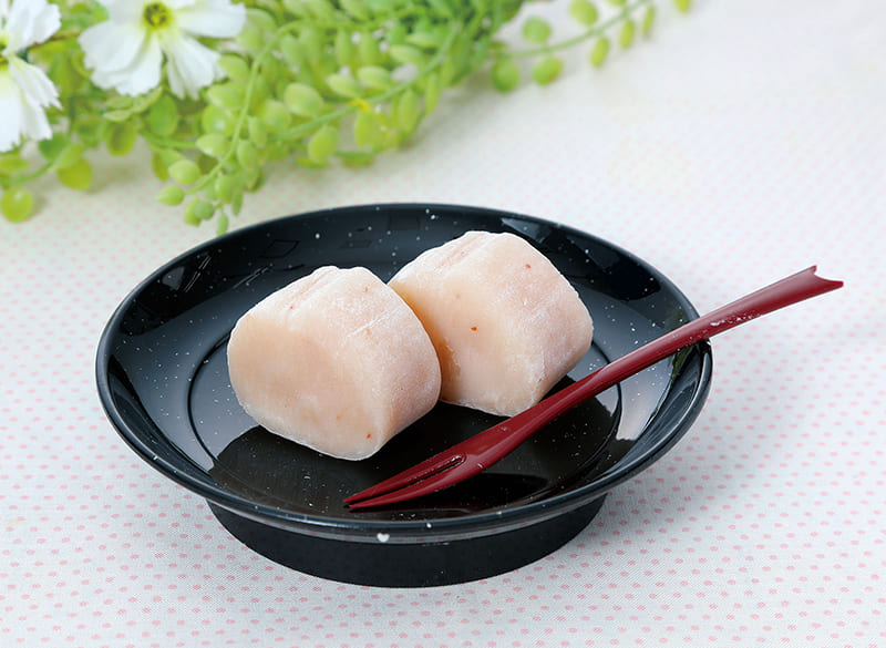 - (4)に再びラップをかけて電子レンジ(600W)で1分加熱する。粗熱がとれたら濡れふきんの上に置き、さらに滑らかになるまで練る。まな板に片栗粉(少々、分量外)を振り、生地を棒状に成形する。巻きすにラップを置き、生地を置き、巻きすできつめに巻き、両端に輪ゴムをして1時間程なじませる。食べやすい大きさに切って皿に盛る。